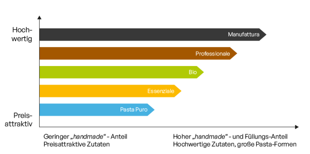 Das gesamte Sortiment lässt sich in unterschiedliche Qualitätsstufen einteilen. Wichtige Rollen spielen dabei der „handmade“- wie auch der Füllungsanteil. Auch höherwertigere Zutaten und die Größe der Pasta-Formen bestimmen die Zuordnung. Angefangen bei Produkten mit schneller Zubereitung im attraktiven Preissegment, über ideale GV-Profi-Pasta bis hin zur Premium-Pasta: für zahlreiche Einsatz- und Kombinationsmöglichkeiten passen unsere Produkte in jede Küche, ob klassisch, modern oder typisch italienisch.